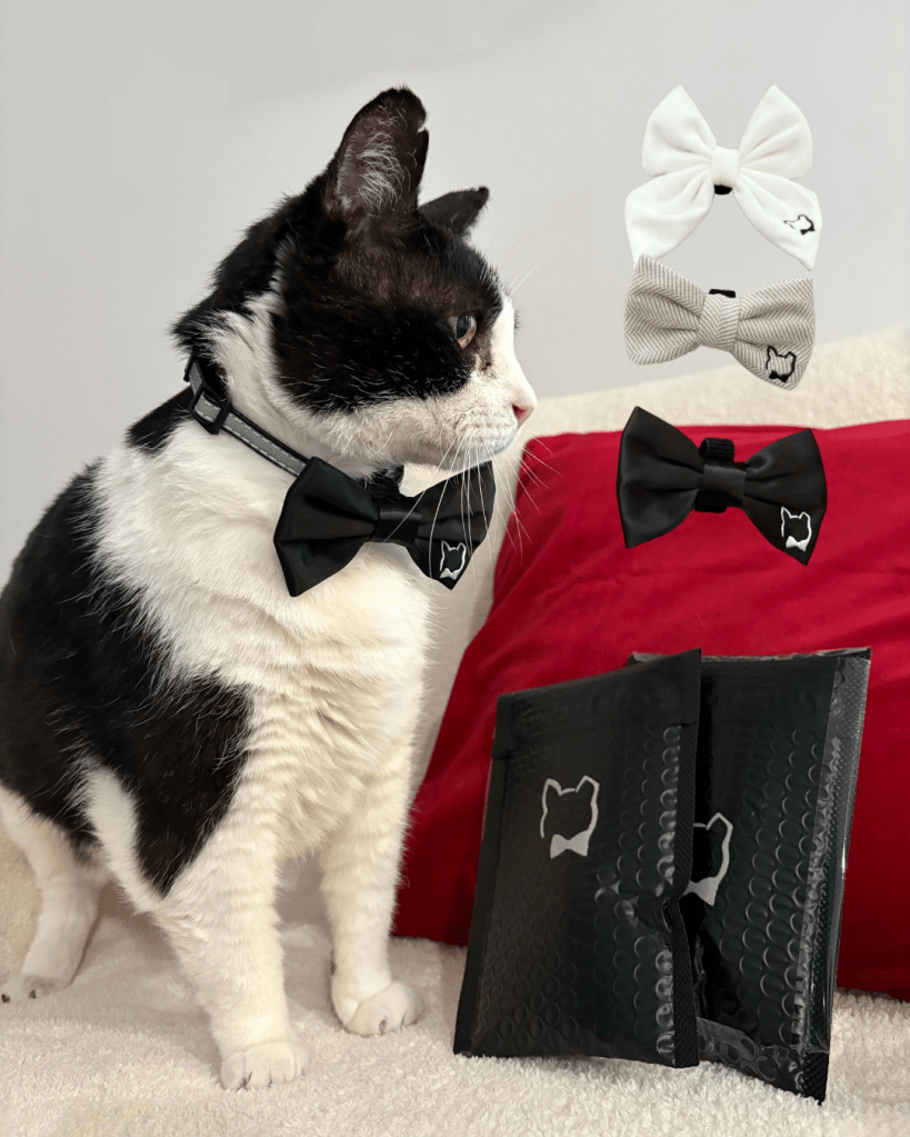 Around 9 years ago, Mr Binx quite literally walked into my life and became my “Disney princess animal sidekick” and best friend. What better time than Mr. Binx’s (made up) birthday to share about my favorite tuxedo cat’s luxury pet bow tie business